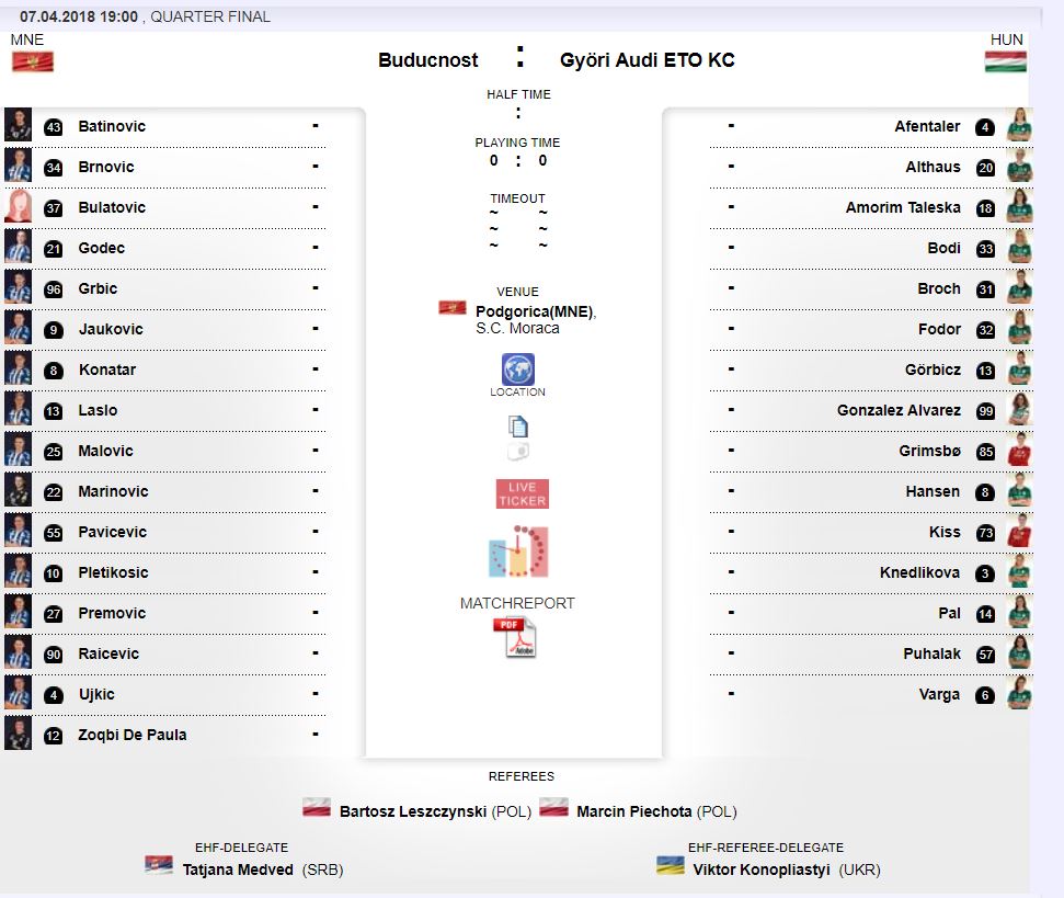 18.20: Sajnos a nap rossz hírrel kezdődött: az amúgy is sérülésekkel tizedelt csapatból kidőlt Groot is, aki a jövő szombati visszavágon sem léphet pályára. Szerencsére Nycke sérülése nem olyan súlyos, mint Tomori Zsuzsanna, valamint a norvég Nora Mörk sérülése akik már biztos nem lépnek pályára a tavaszi idényben.