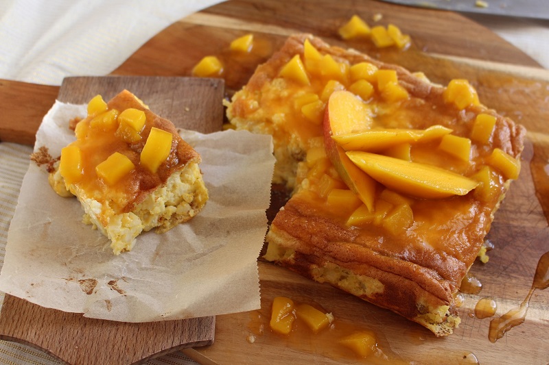 5. A masszához a végén a fél mangót felkockázva adom, majd egy sütőpapírral bélelt 20×25-ös tepsiformába töltöm, a tetejére pedig a vajból kockákat szórok.