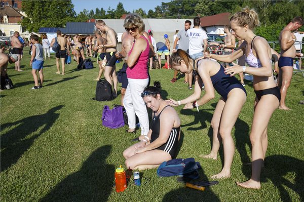 Naptejjel kenik be egymást a résztvevők a 37. Lidl Balaton-átúszás előtt Révfülöpön. Fotó: MTI/Varga György