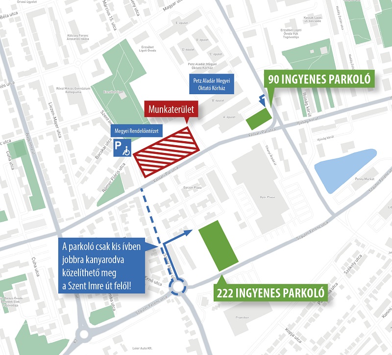 Május 20-tól lezárják a Petz Aladár Megyei Oktató Kórház parkolójának nagy részét. Az ideiglenes parkoló a Szent Imre út felől közelíthető meg, ahol 220 ingyenes parkolóhely áll rendelkezésre.