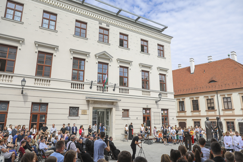 „Egykori iskolaigazgatóként és tanárként tudom, hogy milyen sokat jelent egy tanév kezdetén, ha olyan tárgyi vagy szellemi érték érkezik az iskolába, amivel javulhat az oktatás színvonala” – kezdte beszédét Borkai Zsolt polgármester, majd felidézte azt is, hogy a Széchenyi tér állapota a 2010-es felújítás előtt nem volt méltó a barokk környezethez. Számos vita alakult ki a Lloyd-palota körül is, voltak, akik ellenezték, hogy az önkormányzat megtartsa az épületet. „Végül ezt is felújítottuk, s most boldog vagyok, hogy a gimnázium tevékenységét segíti a jövőben. Egy város működésének és fejlődésének elengedhetetlen pillére az oktatás. Az itt végzett munkával évszázadokra alapozott tudást és értékeket közvetítenek a diákok számára, akik hasznos állampolgáraivá válnak az országnak, s Győrnek, hiszen sokan a városban maradnak” – mondta el Borkai Zsolt.