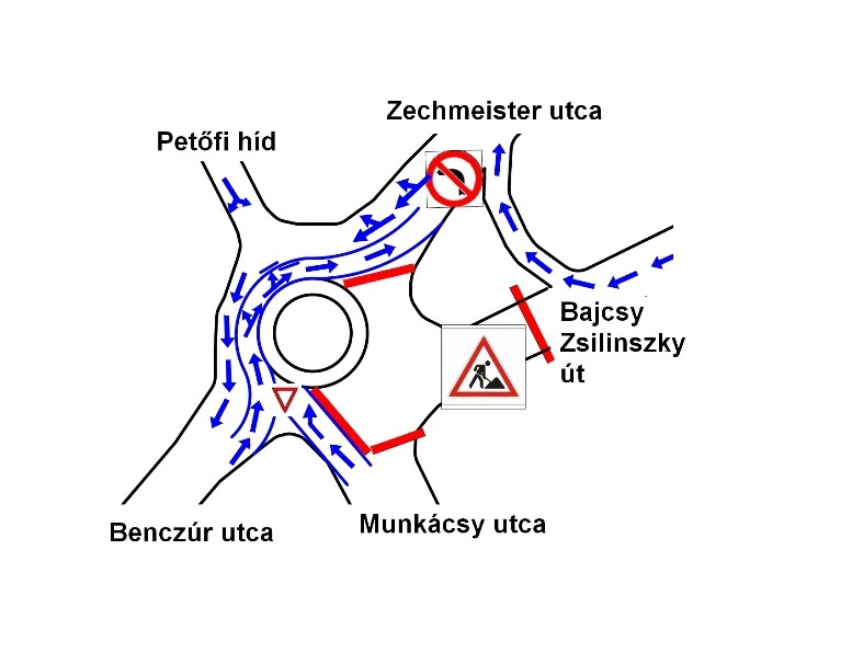 A Petőfi híd felől érkezők a Benczúr utca irányába tudják elhagyni a csomópontot, a Munkácsy út irányába nem haladhatnak tovább. Nekik a Belváros felé az Újlak utca – Révai u. útvonalat javasoljuk.