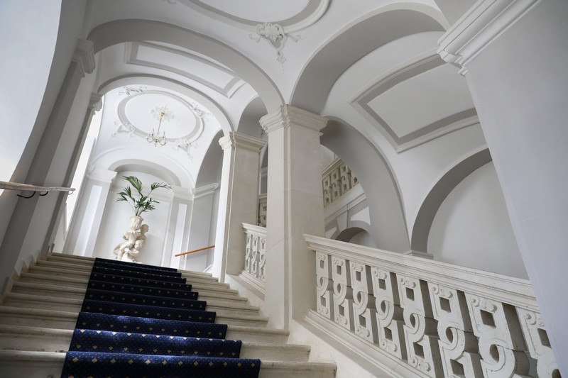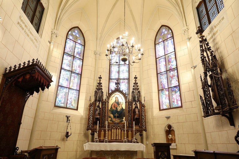 A főbejárat felett megcsodáltuk a klasszicista oszlopokon nyugvó kocsibehajtót, majd a barokk lépcsőházat, amely a 18. század második felében készült Hefele Menyhért tervei alapján. A palota gótikus kápolnájába lépve, melyet 1481–1486-ban vélhetően Nagylucsey Dóczy Orbán püspök építtetett, majd 1858–60-ban nyerte el mai formáját, láthattuk a Szűz Máriát ábrázoló oltárt, melyet Szent István és Szent László királyok szobrai fognak közre. A kápolnában több Kossuth-címer is látható, mellyel Simor János püspök az 1848–49-es szabadságharc leverését követő passzív ellenállással való szimpátiáját kívánta sugallni.