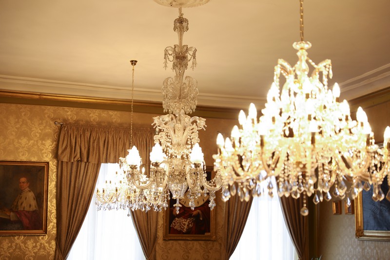 Betekinthettünk a nagyebédlőbe és a szalonokba is, melyek bútorzata nagyrészt a 18. század végén, a 19. század elején készült, de például az ebédlő hatalmas csillárja Zalka János püspök idején, a 19. század végén került a patinás berendezéshez. A szalonok a falakat díszítő tapétákról kapták nevüket, így van zöld és vörös szalon.
