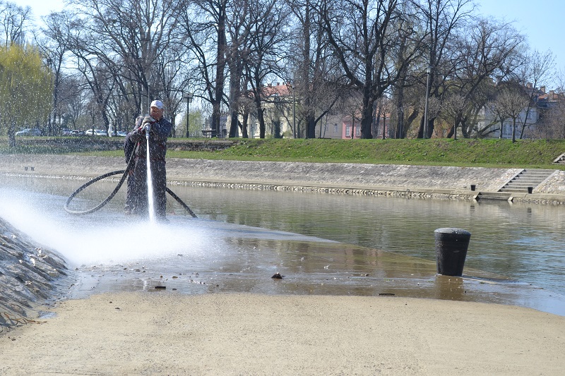 A Rábán és a Mosoni Dunán a héten megemelkedett a vízszint, a víz kifolyt a vízparti sétányokra is, ezért időszerűvé vált a burkolatok megtisztítása.