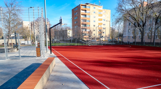 A sportpálya szinte teljesen megújult: a területet kerítés fogja közre, a pályán gumi burkolat található, az esti világításnak köszönhetően pedig sötétedés után is használható. Bővült a sportolási lehetőségek köre, hiszen nemcsak teqball pálya, hanem 4 db kosárpalánk is elhelyezésre került. A fiatalabb korosztály számára sportpálya mellett, a kerítésen kívül egy tér került kialakításra, amelynek központi eleme a nézők számára tervezett ülőfal. Továbbá, egy pingpongasztal is helyet kapott a téren.