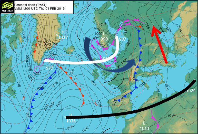 Az 1. ábra a csütörtök 13.00 órára (CET) várható időjárási helyzetet ábrázolja. A fekete vonallal jelzett magas nyomású zóna „felett” most úgy tűnik, kicsit délebbi pályán (fehér vonal) fognak Európába „harapni” a ciklonok. Előőrsük hidegfrontja csütörtökön szeli át hazánkat, esőt – a hegyekben havat –, szélerősödést és némi lehűlést hozva.