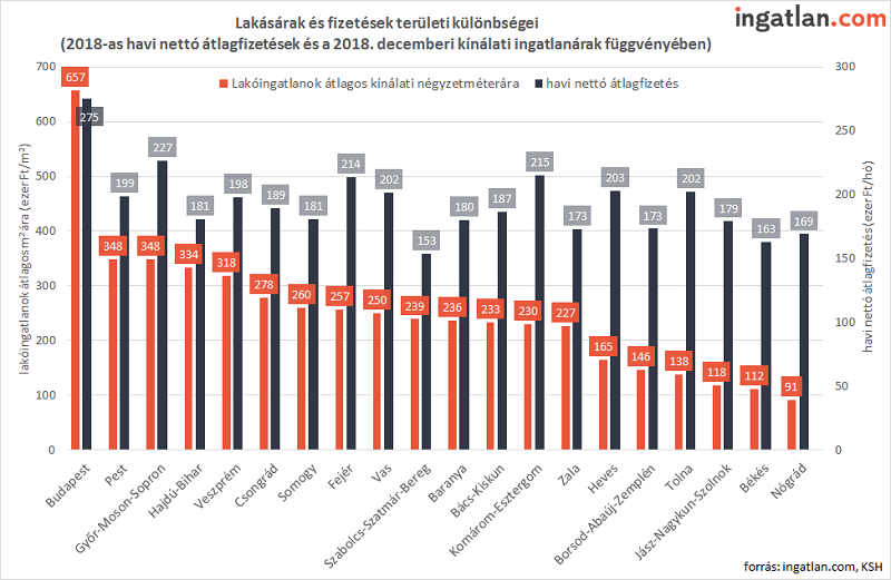 Az ingatlan.com elemzése az országos különbségeket bemutatja úgy is, hogy a fővárosi fizetésekhez és átlagos négyzetméterárakhoz méri a többi megyét. A fővárosi fizetés 56-82 százalékát lehet megkeresni a különböző megyékben, Győr-Moson-Sopron áll a legjobban, Szabolcs a leggyengébben az 56 százalékos mutatójával. A lakásáraknál sokkal nagyobb a szórás: a budapesti négyzetméterár 14-53 százalékáért szerepelnek az ingatlanok a különböző megyékben. A Pest és Győr-Moson-Sopron megye 53 százalékkal áll, ez a legjobb helyezés. Nógrád megye pedig a sor végén, ott a budapesti négyzetméterár 14 százalékán van a helyi árszint.