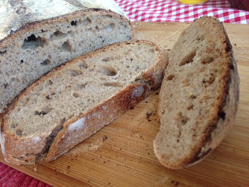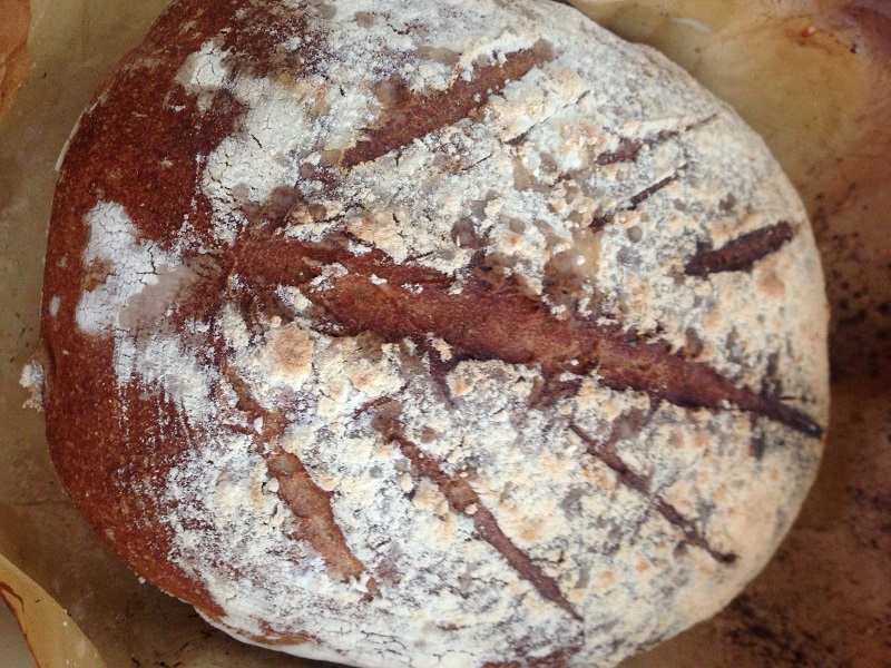 5. A kenyeret ráborítjuk egy sütőpapíros tepsibe (az alja legyen most felfelé), beirdaljuk egy éles nagy késsel, majd a forró sütőben 45 perc alatt ropogósra sütjük. Előbb ne vegyük ki, mert a közepe nem sül át.
