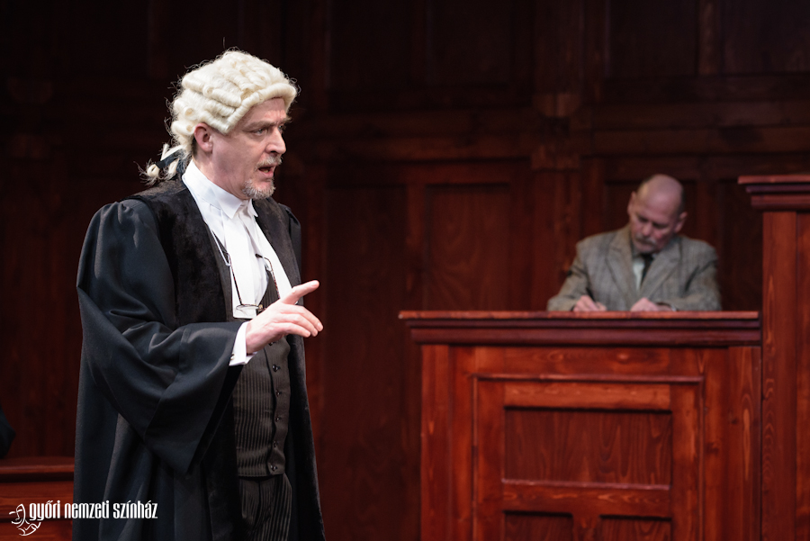 A fokozatosan kibontakozó drámát, a tárgyalás feszültségét tagadhatatlanul az angol humor oldja. A jog, a bíróság nyelvét a parókás-körmondatok jellemzik. Agatha Christie színpadi művét többféle formában, nagy sikerrel dolgozták már fel. A főszereplő, Sir Wilfrid Robarts személyisége pedig mindig kulcskérdés. Győrben a jó nevű ügyvédet Csankó Zoltán alakítja, ő védi Leonard Vole-t (Kovács Gergely), akit egy özvegyasszony megölésével vádolnak. Az ügyész, Mr. Myers (Ungvári István) a tárgyalásra több meglepetéssel is készül. Maga a per, nemcsak az igaság bizonyításáról szól, hanem a két felkészült jogász villongó szópárbajáról is.