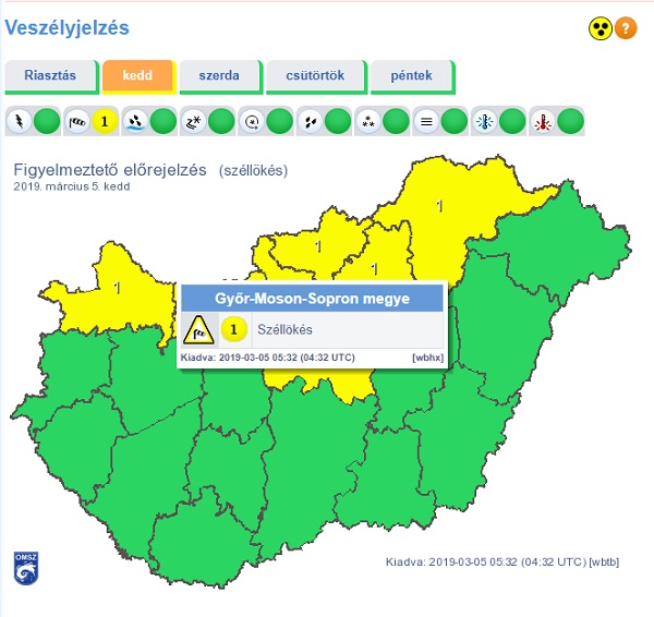 A nyugati, északnyugati szél feltámad, az északi megyékben helyenként viharossá fokozódik, a várt legerősebb széllökések meghaladhatják a 70 km/h-t, ezért mára is figyelmeztetés érvényes.