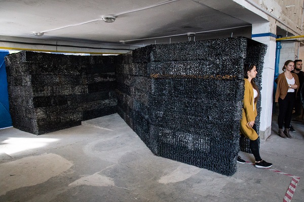 Egy építészcsapat a bejáratot is újragondolta. Vaksötét, kanyargó barlangot építettek, amin a látogatók végig tapogatódzva a művésztérbe juthatnak. „A mi installációnk neve az állapotváltozás nevet kapta. A kérdés az, hogy ki, milyen állapotváltozáson megy keresztül, mire átjut a labirintuson. Olyan belépőt szerettünk volna megalkotni, ami ennek az óriási belső térnek a nagyságát nyomatékosítja a beszűkült, sötét átjáróval. Amibe itt-ott azért bevillan a fény az ipari hűtőbetét elemekből készült barlang falán keresztül” – mondja a csoportja nevében a zalaegerszegi Horváth Gergő, aki harmadéves a Széchenyi István Egyetem építészképzésén. A színházban is elsötétül egy pillanatra a nézőtér az előadás megkezdése előtt, miért ne lehetne ez ugyanígy egy kiállítótér bejáratánál.
