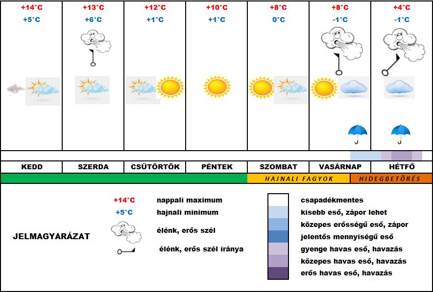 Csapadék csak vasárnaptól várható. A kedd lehet egy ideig az utolsó „nyári” nap. A köd makacsságától függően a nappali maximum elérheti még akár a +16°C fokot is, ködben viszont alig fog +10°C fölé emelkedni. Szerdán jön a változás. A hosszú ideig tartó déli áramlás ideje lejár. A szél északira fordul, megerősödik, a nappali felmelegedés gyengül. Ezután vasárnap délig jobbára napos, csendes idő várható napról napra csökkenő hőmérsékletekkel.