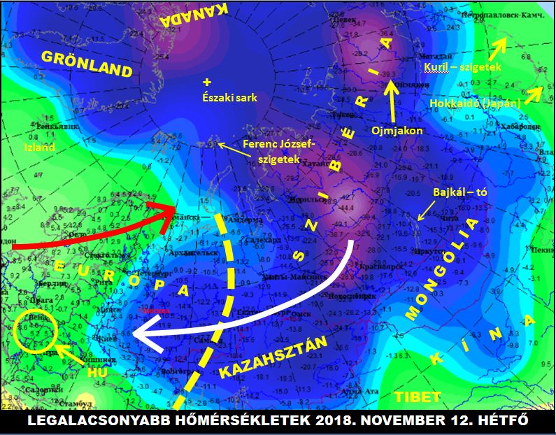 Ami viszont furcsa, hogy nem Ojmjakon az „élenjáró” („mindössze” -39°C), hanem jóval nyugatabbra az Alsó-Tunguzka folyó kanyarjának vidéke -45°C körüli hőmérsékletekkel. Mint egy rossz magaviseletű diák, az ilyen levegő nem tud nyugton maradni, a hidegben kialakult anticiklon déli peremén óhatatlanul megindul DNy felé (fehér nyíl). Moszkvában jelenleg a nappali maximum is 0°C alatt alakul.