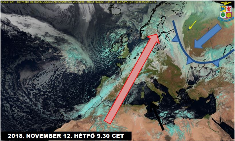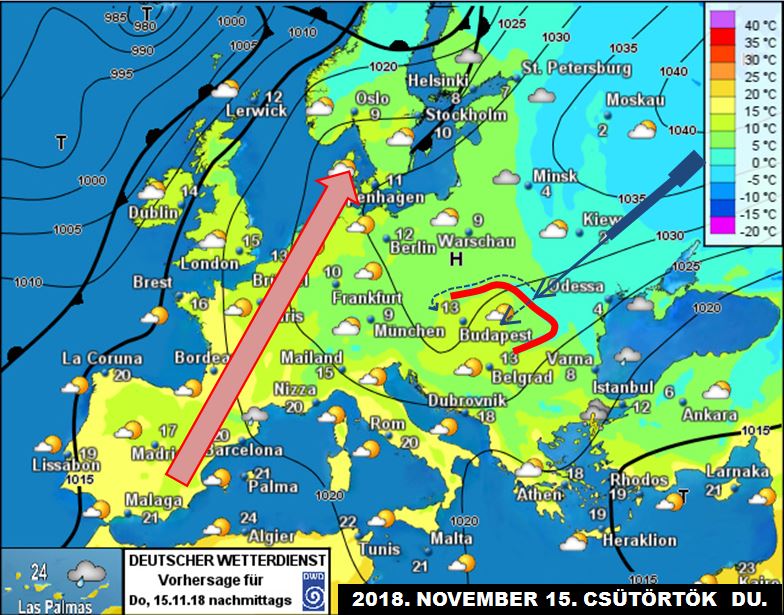 A 3. ábra műholdfelvételén jól kirajzolódik az Európa felé tartó hidegfront, mely mögött a hideg, csont-száraz levegőben remekül kirajzolódik a Ribinszki-víztározó (sárga nyíl). Az OMSZ fronttérképén (4. ábra) viszont az is látszik, hogy DNy felől az enyhe levegő még mindig jelentős utánpótlással rendelkezik, ezért a front felettünk jelentősen gyengül, s a hideg levegő a Kárpátok körüli kerülőre kényszerül (5. ábra, a Német Meteorológiai Szolgálat csütörtökre vonatkozó előrejelzése).