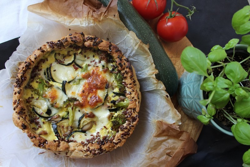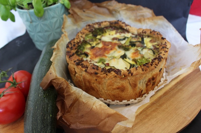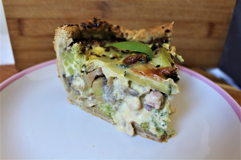 5. A sütőt előmelegítem, a tésztával kibélelt formába beletöltöm a zöldségeket, szalonnát, ráöntöm a szószt és beteszem a 180 fokos sütőbe 45 percre.