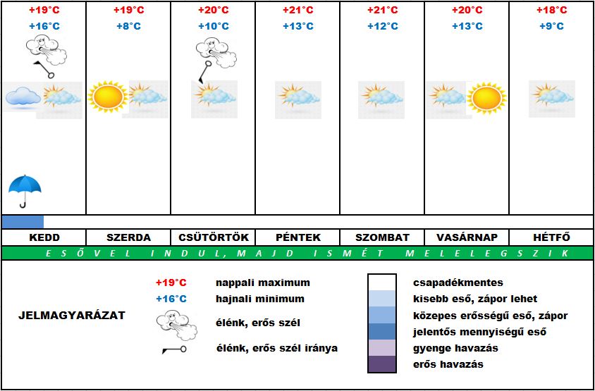 A kedd reggel dél felől érkező hidegfront hatására ugyan szerda reggel kicsit hűvösebb lesz, de utána a hét legvégéig hajnalban sem csökken a hőmérséklet +10°C alá, napközben, a hét második felére pedig ismét meghaladhatja a +20°C fokot. Mindemellett valószínű túlzás lenne még zavartalan napsütést is várni. A folyók vízállását a hét elején az Alpokban lehulló bőséges csapadék ugyan meg fogja emelni, de a földek tovább szomjaznak.