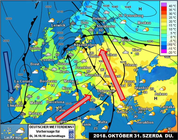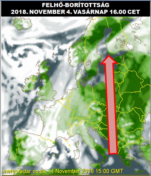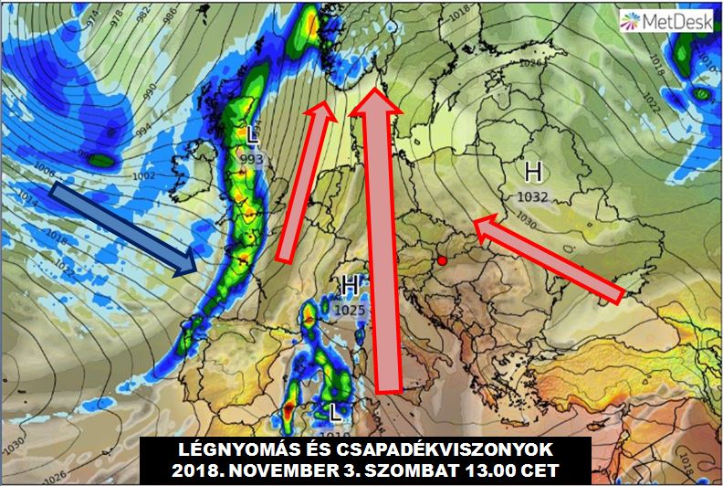 A ciklon elvonulása után ismét egy magas nyomású képződmény „ül” Európa nagy részére, és a kelet-európai központja, illetve az atlanti alacsony nyomású zóna közti széles folyosóban, déli áramlással enyhe és viszonylag száraz levegő fog haladni észak, így hazánk felé is (4. ábra).