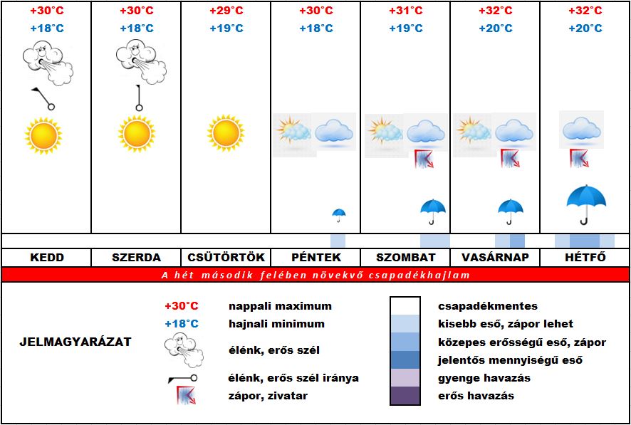 Keddtől csütörtökig szűkebb kisalföldi hazánkban gyenge lesz a nappali gomolyfelhő-képződés, a napsütés fog dominálni. A kedden és szerdán megélénkülő északnyugati, északi szél csütörtökre mérséklődik. Péntektől magasabbra tornyosulnak a gomolyfelhők, s pénteken még csak elvétve, szombattól azonban szórványosan alakulnak ki záporok, zivatarok, melyek csak a fülledtséget növelik, s a hőmérséklet tovább emelkedik. A szél csak zivatarok idején erősödik meg. A hét elején tehát az esernyőket szabadságoltatni lehet, de péntektől ismét szükség lehet rájuk, miközben a hőmérséklet elképzelhető, hogy +35°C körüli értékekkel fogja meglepni augusztus elsejét.