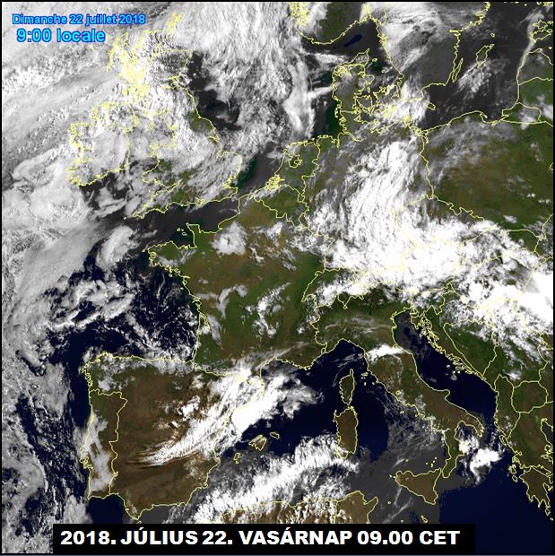 A 2. ábra vasárnap reggeli műholdfelvételén Magyarország sűrű felhőkbe burkolózik, de Győrben ebből még egy kis locsolásra sem tellett. Keddtől még ennyi felhő sem lesz felettünk, a sekélyciklon dél-délkelet felé távozik, s az Azori-anticiklon peremének védelmében jobbára napos, nyári időben lesz részünk.