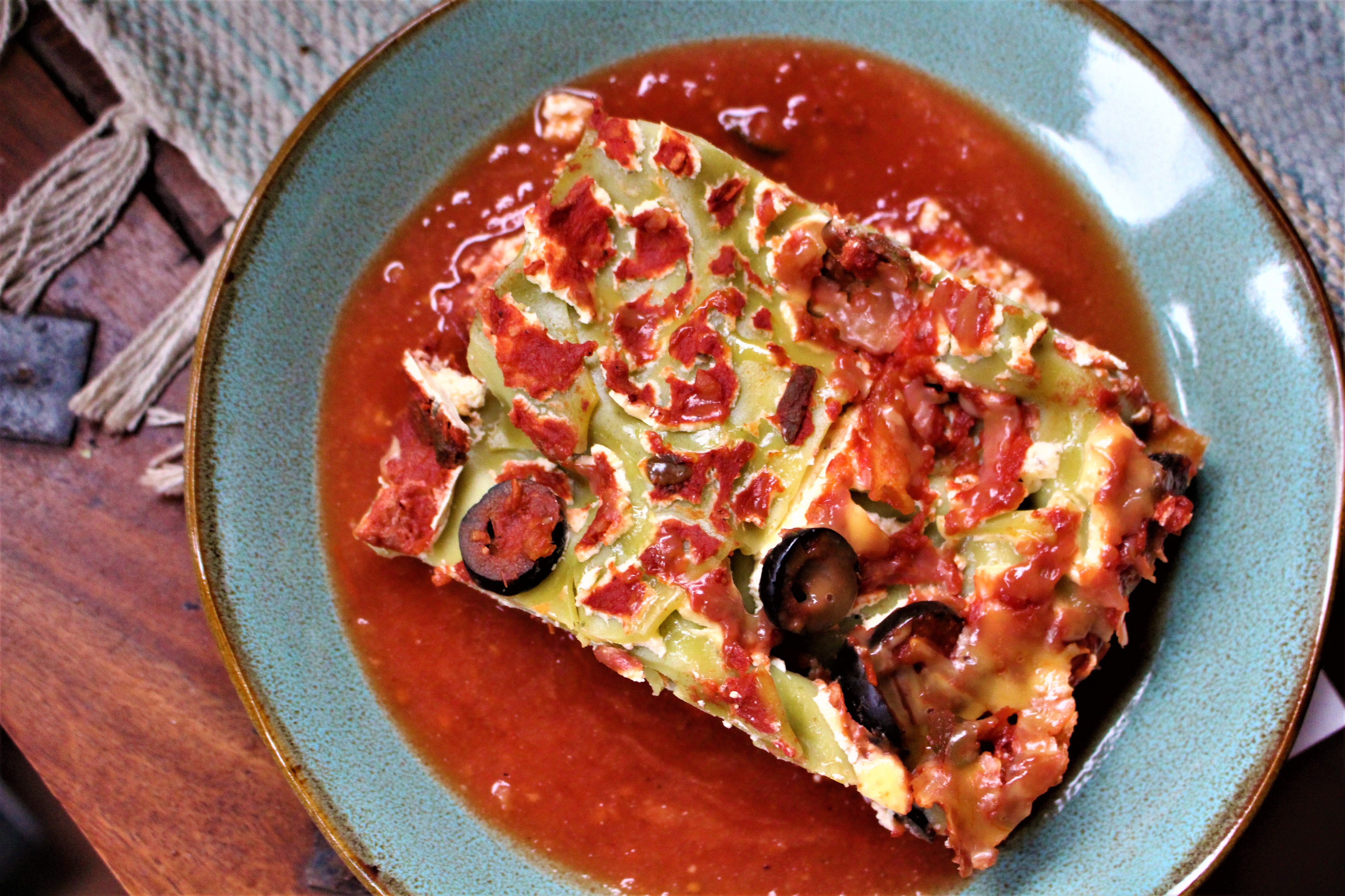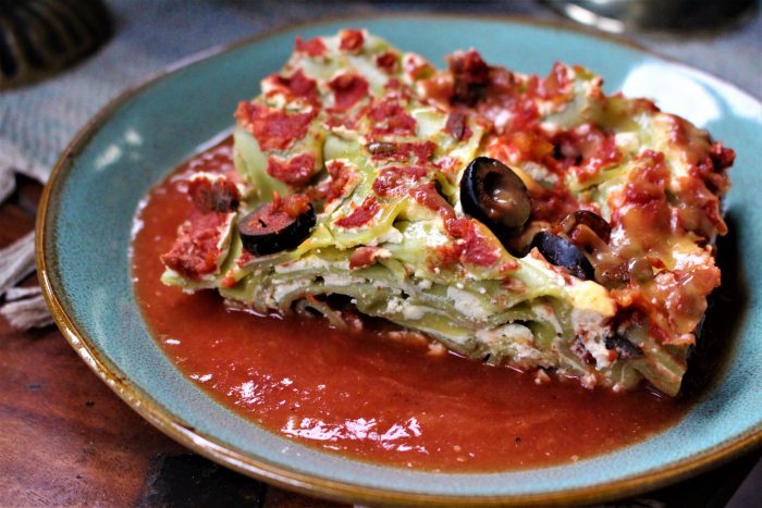 - Egy közepes sütőtálat veszek elő, aminek az aljába egy kis paradicsomszószt öntök, erre kezdem rétegezni a lasagne tésztát a ricottával, karikázott olívabogyóval. A végén felöntöm az egészet a szósszal, egy picit félreteszek belőle.