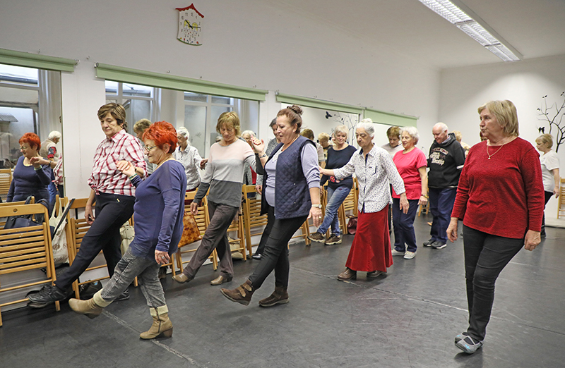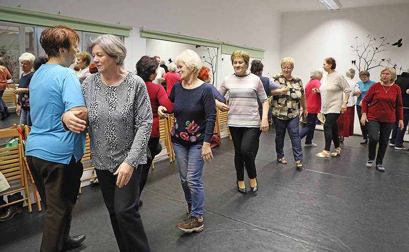 Vidám csevely, nevetés tölti be a Generációk Háza tükrös termét szerdán délelőtt, amikor ellátogattunk a Szenior örömtánc foglalkozásra. Varga Katalin oktató beszélgetés helyett invitál, próbáljuk ki magunk is, milyen nagyszerű elfoglaltság az örömtánc.