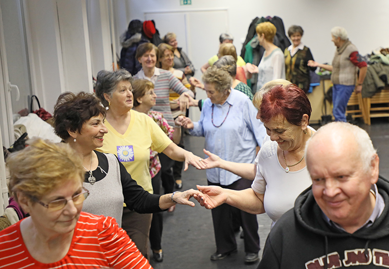 A harminc résztvevő közül egyetlen férfit látunk, ő is most jött először, a korosztály az 50 évestől a 90 évesig terjed. A hölgyek felveszik elegáns táncos, vagy éppen kényelmes cipőiket és izgatottan várják a kezdést. Katalin arról beszél, hogy a senior örömtánc már 45 éve ismert a nyugat-európai országban, de hazánkban csak nemrég jutott el. Amikor ő először hallott róla, rögtön jelentkezett, elvégzi a szükséges oktatói tanfolyamot.