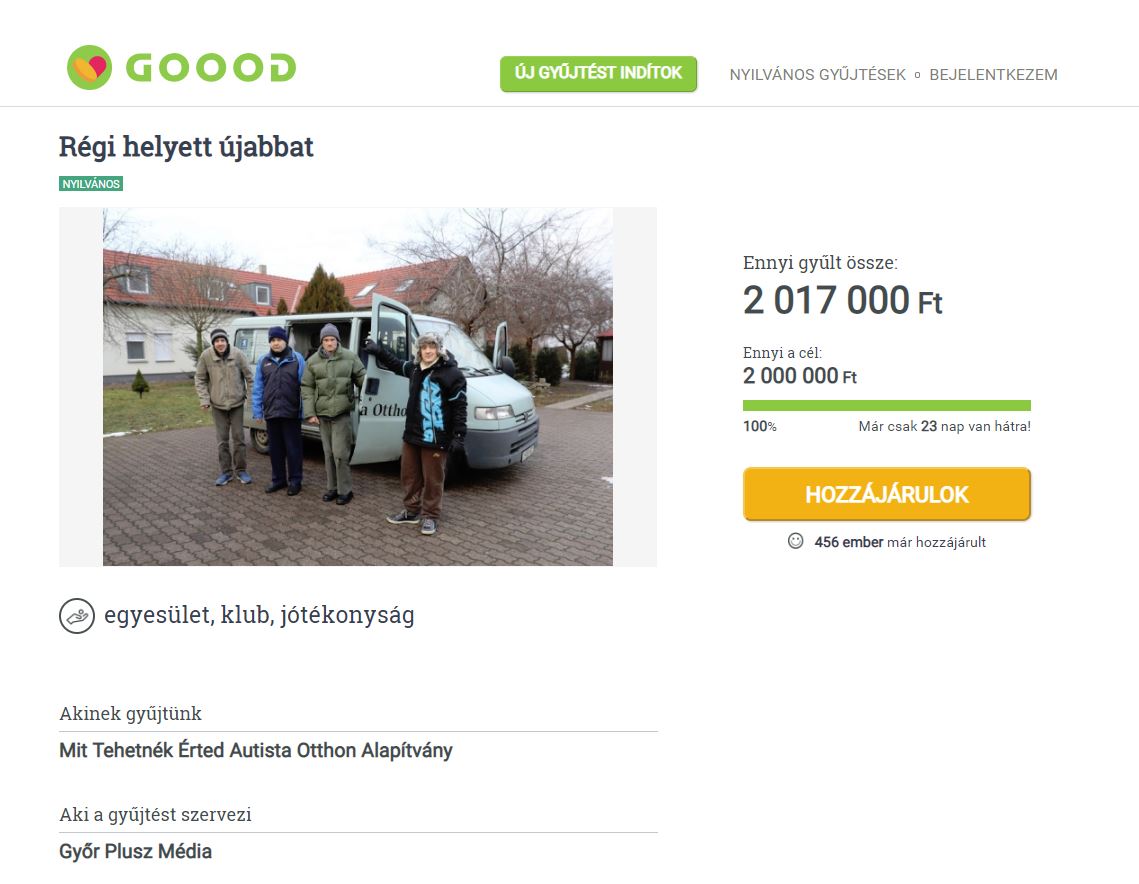 A február elsején írtuk meg, hogy gyűjtést indított a Győr+ Média: olvasóink, hallgatóink és nézőink segítségét kérjük, hogy a mindszentpusztai autista-lakóotthon egy kisbuszt vásárolhasson a régi helyett, amire már a műszakit sem kapták meg, olyan elavult. A kicsit több mint hárommillió forintba kerülő járműre egymillió forintot sikerült félretenniük, a „maradék”, nem kis összeget vártuk a jóindulatú emberektől. Akikből pedig tényleg rengeteg van: csütörtökön reggel 455 ember hozzájárulását jelezte a mutató, de persze tudjuk, hogy ennél sokkal többen voltak azok, akik gurítottak jó néhány százast a kisbuszba.