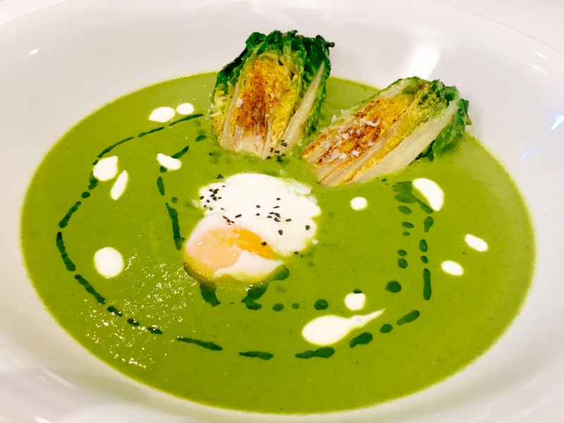 A szívsalátát félbevágjuk és kevés olívaolajon – vágott felével lefele – meggrillezzük, majd egy kevés pehelysóval meghintjük. Az üde zöld krémfőzeléket a grillezett szívsalátával és a lágy tojással tálaljuk.
