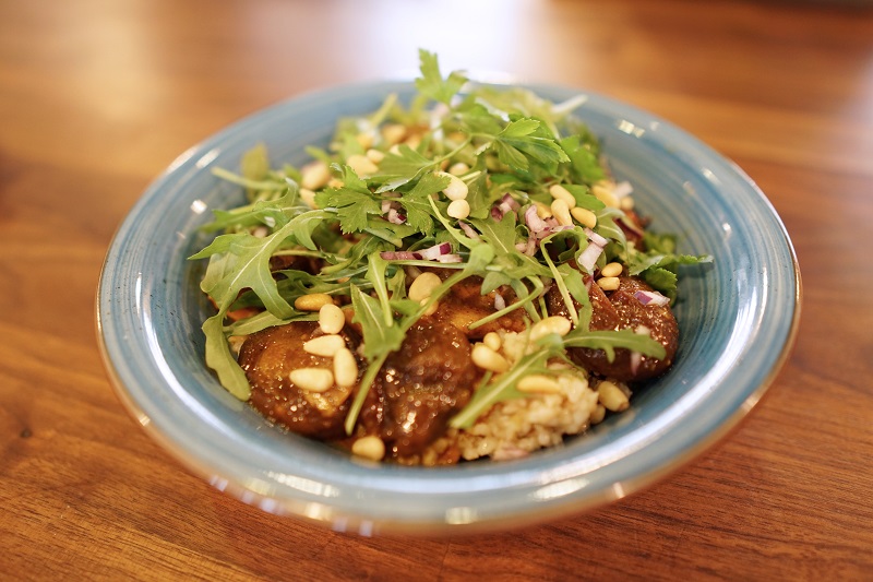 A bulgurhoz kétszeres mennyiségű sós vizet forralunk, majd a bulgurt belehelyezzük, megkeverjük és néhány perc főzés után lezárjuk, állni hagyjuk. Mikor a bulgur megpuhult, olívaolajjal átkeverjük és a tajine-nal tálaljuk. Az egészet friss petrezselyemmel és rukkolával díszítjük.