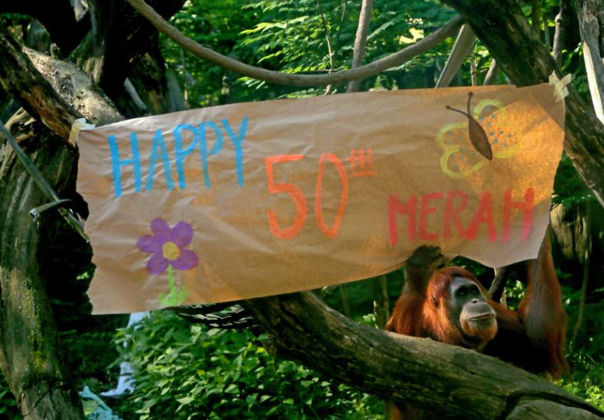 A St. Louis-i állatkert Merah nevű szumátrai orangutánja ötvenedik születésnapján ünnepelte hétfőn.