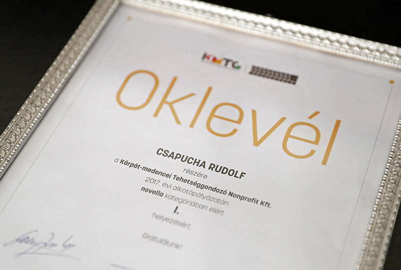 „Mikor 2014-ben segédmunkás pozícióba a Győri Nemzeti Színházhoz kerültem, a teátrum miliője egyszerűen magával ragadott és a múzsa újra kopogtatott az ajtón, kezembe nyomta a tollat, orrom elé pedig papírt rakott. Nagyon szeretem a társulatot, az ott dolgozó munkatársaimat és a művészeket” – árulja el az amatőr író, akit a családja és a színház mellett egy írói csapat is folyamatosan inspirál, ugyanis tavaly csatlakozott a Győrben működő Író Alkotók Klubjához. „Dittrich Panka vezetőnkkel és írótársaimmal minden hónapban találkozunk és egymás alkotásaiból töltekezünk. Nagyon jó érzés, hogy különbözőek vagyunk, mégis tiszteljük és szeretjük a másik munkásságát. Talán ennek is köszönhetem, hogy a versek mellett a prózaírással is elkezdtem foglalkozni. Egyik délután jött az e-mail Pankától, melyben elküldte azt a bizonyos pályázati felhívást. Mikor elolvastam a feltételeket, gondoltam „miért ne?” végülis veszteni valóm nincsen, de azt álmomban sem gondoltam, hogy egy ilyen versenyen első lehetek” – meséli el az előzményeket édesapám, majd felidézi a december 16-ai gálán történteket, ugyanis ezen a napon Budapesten vehette át, a számára nagy presztízs értékkel bíró első helyezésnek járó díjat és az oklevelet. „Több kategóriában értékelték az alkotókat, így vers, mese és novella kategóriában. Utóbbira közel 400-an küldtük be a munkánkat. Mikor a műsorvezető elkezdte mondani, a harmadik, majd a második helyen végzett írók nevét egyszerűen nem hittem a fülemnek, hiszen ott döbbentem rá, hogy én maradtam a végére, vagyis ennyi remek novella közül, az én írásom, a „Három idegen” nyerte el leginkább a társadalmi zsűri tetszését.”