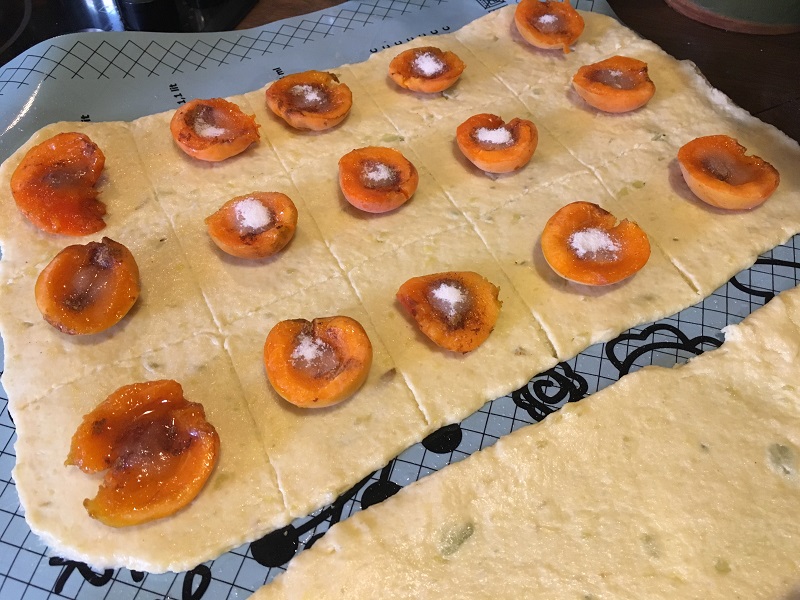 2. A tésztát kétfelé osztom, az egyiket a nyújtódeszkán, a másikat egy sütőpapíron nyújtom ki pici olajjal, egyforma nagyságúra. Az egyik felét felkockázom, nekem 15 db kocka lett (azaz derelye darab). A kockák közepébe helyezek 1-1 fél barackot, amit félbevágtam és kicsit lelapítottam a tenyeremmel, azt meghintem kis fahéjjal, vaníliás cukorral.