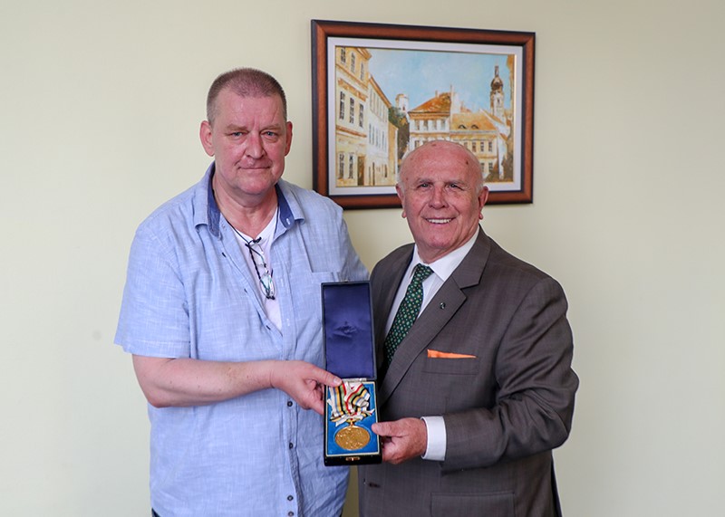 Palotai Károly olimpiai bajnok labdarúgó, az ETO egykori kiválósága, a világ egykori legjobb játékvezetője, sportdiplomata, városunk egyik nagy alakja tavaly távozott közülünk. Fia, Palotai László a napokban számos emléket, kupákat, érmeket, okleveleket adományozott a városnak, amelyeket az önkormányzat nevében dr. Somogyi Tivadar alpolgármester vett át.