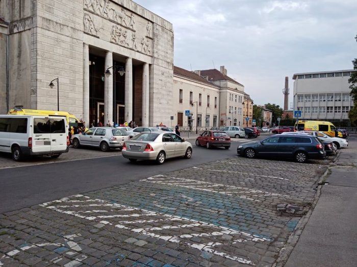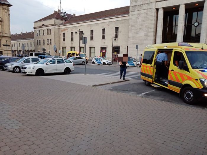 A vasútállomás elé két mentőautó is megérkezett, az egyik vélhetően a dühöngő férfi miatt, a másik pedig a sérült rendőrnőt látja majd el.