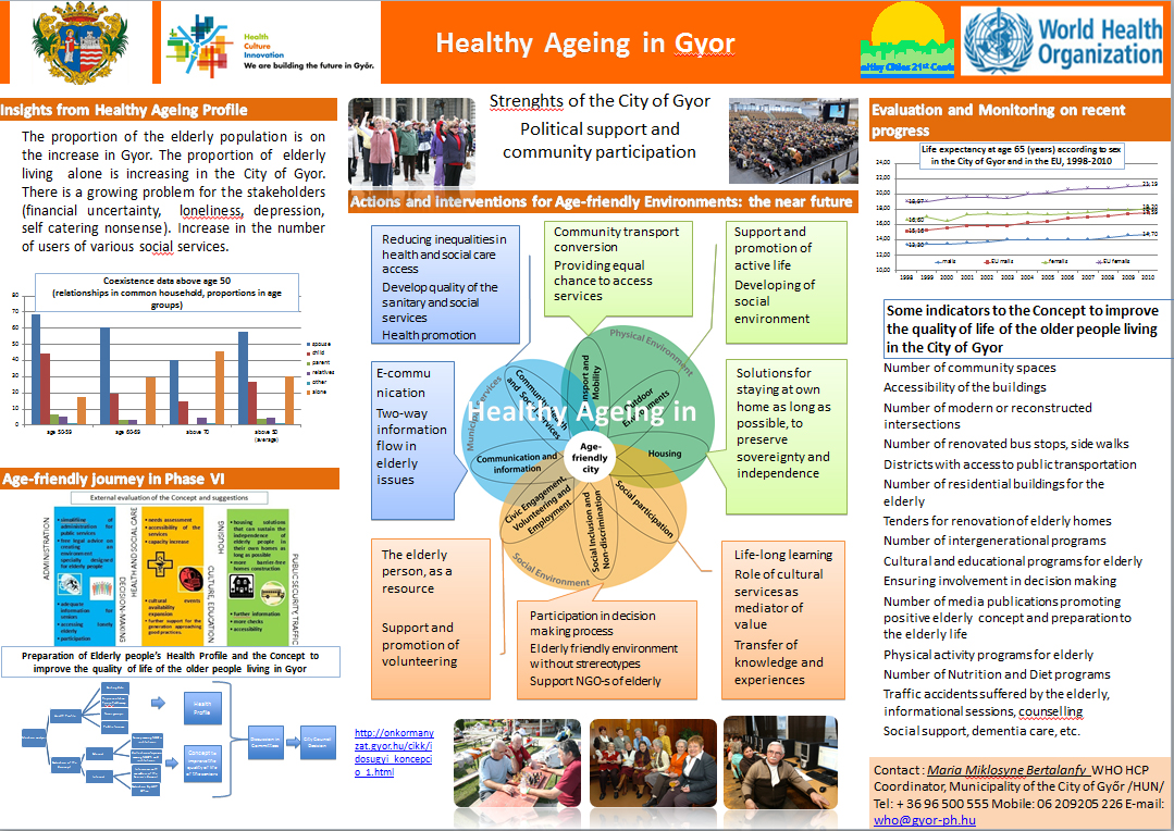A konferenciát megelőző napon tartotta ülését az Idősek Egészsége Munkacsoport, amelynek egyedüli magyar résztvevője Győr volt. A résztvevő tagvárosok posztert készítettek az idősek érdekében végzett tevékenységeikről. A győri WHO Iroda által készített anyagot Takács Tímea a Szociális Egészségügyi és Lakásügyi Bizottság elnöke mutatta be. Kérdésünkre elmondta, az elkészített poszter jól tükrözte a város elkötelezettségét az idősebb generáció iránt és a város kifejezett célját, egy élhető környezet megteremtését számukra. „A poszter segítségével bemutattuk a jó győri gyakorlatainkat – így többek között szó esett az idős emberek lakhatási körülményeinek javítását célzó idősbarát lakásprogramról, a Beszélgető Hálózatról. Ha már Győr, akkor a sport sem maradhatott ki, beszéltünk a város által támogatott szépkorúak tornájáról is, melyen ingyenesen vehetnek részt az aktív idősek, s persze az Idősügyi Tanács munkáját is kiemeltük.”