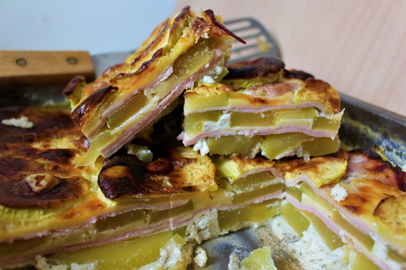 1. A tököt meghámozom, felkarikázom 1.5 cm vastagságúra. Egy közepes tepsibe elkezdem rétegezni: tök, sonka, sajt és tejföl.
