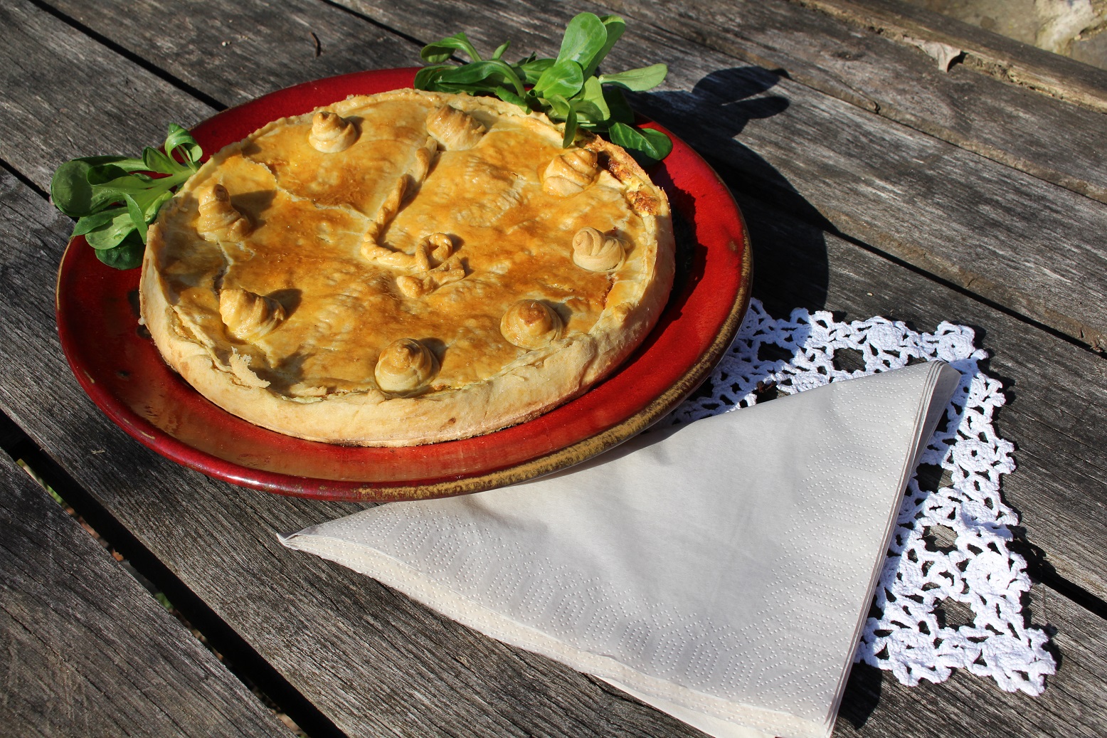 5. A tetejét 1-2 helyen megszúrom késsel, fogpiszkálóval, hogy a gőz távozzon. A megmaradt tésztából szalagokat vágtam és feltekertem csigának. Lekentem a megmaradt fél tojással és a sütőben 30 percig, aranybarnára sütöttem.