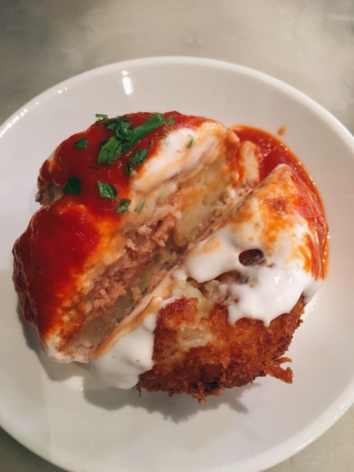 Ilyen volt a La Bomba: krumpligolyó, pikáns chorizoval (spanyol kolbász) töltve, ropogós panírban frissen sütve, majd fokhagymás tejföllel és paradicsomszósszal leöntve. Maga a tökély!