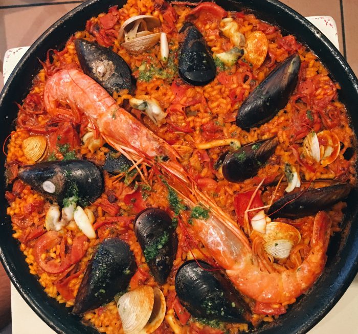 A híres paella! Valóban az, hiszen minden hirdetőtáblán, étlapon ezt látjuk első alkalommal. Azonban, nem mindegy, hol esszük, és ehhez van is egy történetünk. Spanyol barátnőnk ajánlotta a helyet Barcelonában, ahol egy kis utcában, helyiekkel, csak spanyolul beszélő séflány fogadott. Szabad asztal nem mindig van, de nekünk szerencsénk volt. Séfünk bemutatta nyersen az alapanyagokat, amiből bátran válogattam, hogy előételnek és kóstolónak kiváló lesz.