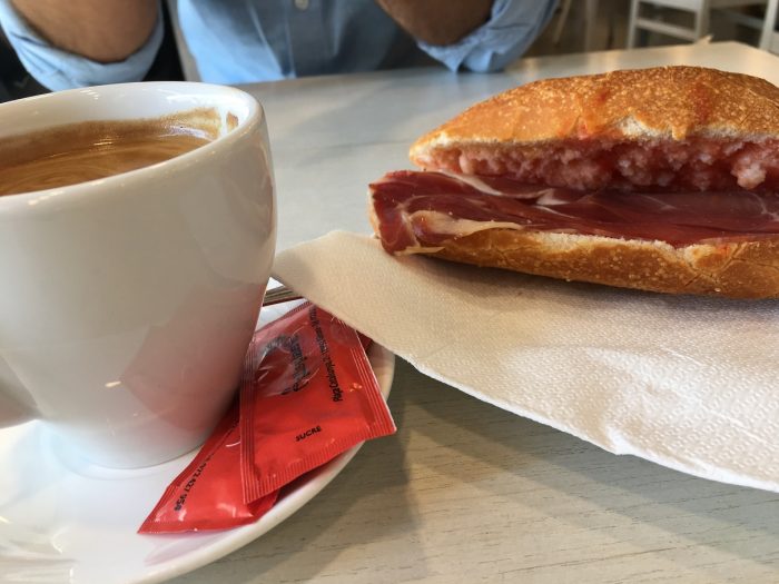 Másnap reggel folytattuk a vadászatot. Bárhol hozzájuthatunk baguette-tel (ejtsd bágett) kínált sonkához, sajthoz és pezsgőhöz. Több verzióban kipróbáltuk, ami közös volt bennük: minden baguette frissen pirított volt, amit meglocsoltak a paradicsom leves-magvas részével és olívaolajjal. Olyannyira jó ötletnek tartom, hogy a kevésbé egészséges krémsajtok és vajak helyett is ezt használom majd a szendvicseinkbe ezek után.