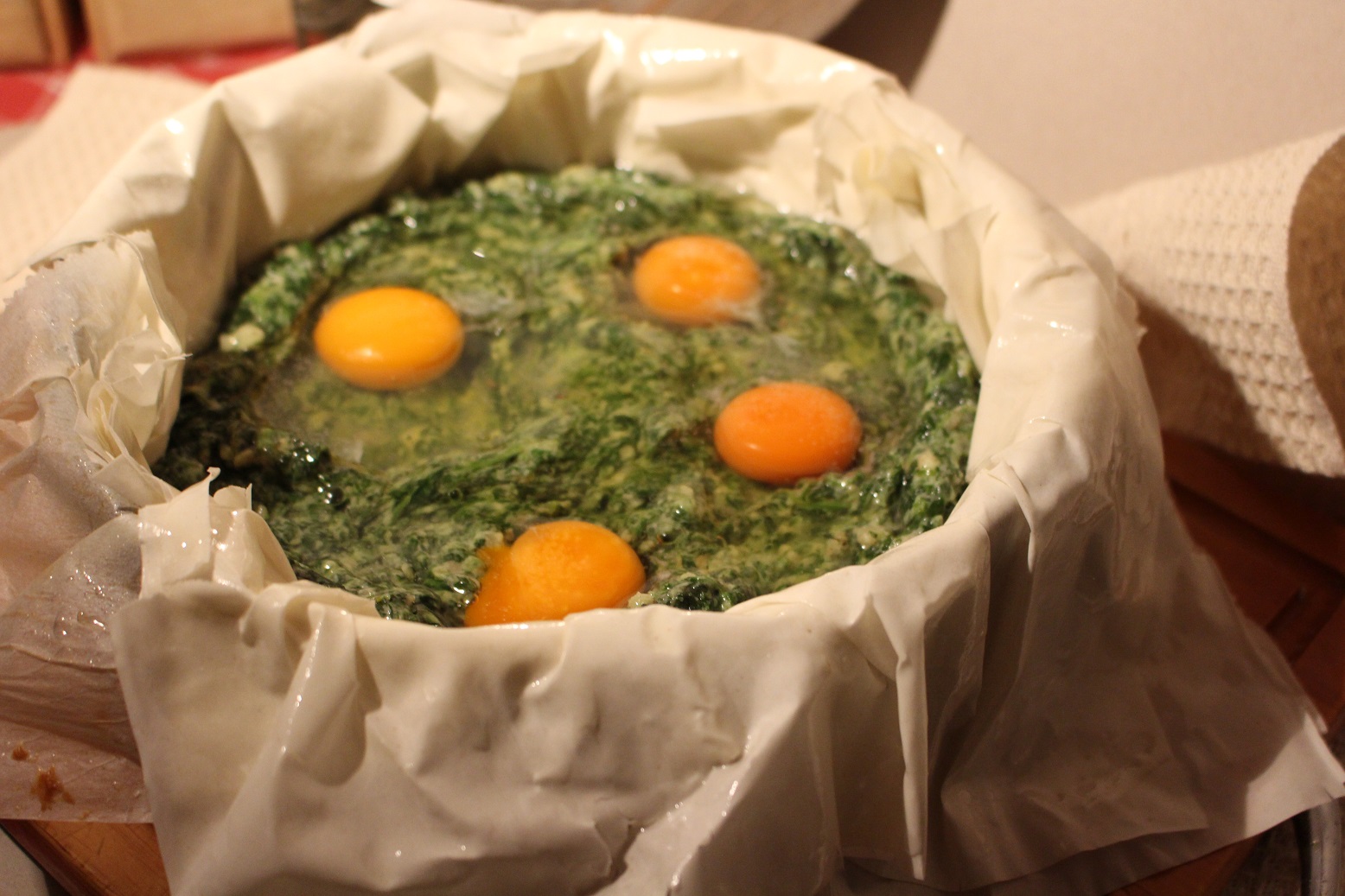 3. A tejszínt egy kis tálba öntjük, simára elkeverjük benne a lisztet és a forró spenóthoz öntjük, amikor felforrt és sűrű, levesszük a tűzről. A ragut a tésztás formába töltöm, 4 mélyedést vájok bele és abba öntöm a tojásokat. Befedem a kilógó tésztával.