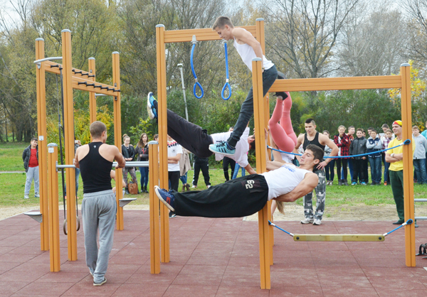 Az átadón a Street Workout Győr – elnevezésű csapat látványos módon be is mutatta, mire is használhatók az eszközök.