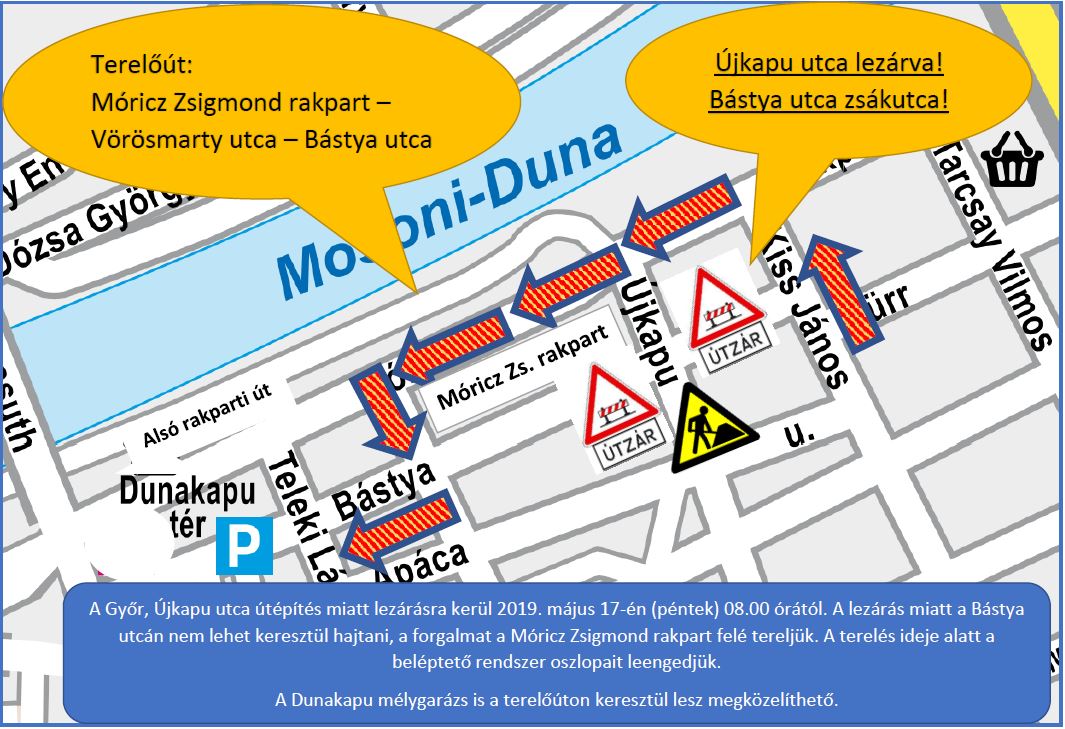 A forgalmat a Móricz Zsigmond rakparton egyenesen a Dunakapu tér irányába terelik, ahol a terelés idejére a gyalogos-zóna beléptetőit leengedik. A forgalom tovább haladhat a Vörösmarty utcáig, amibe bekanyarodva az autósok visszatérhetnek a Bástya utcába. Ezen az útvonalon lesz elérhető a Dunakapu mélygarázs is.