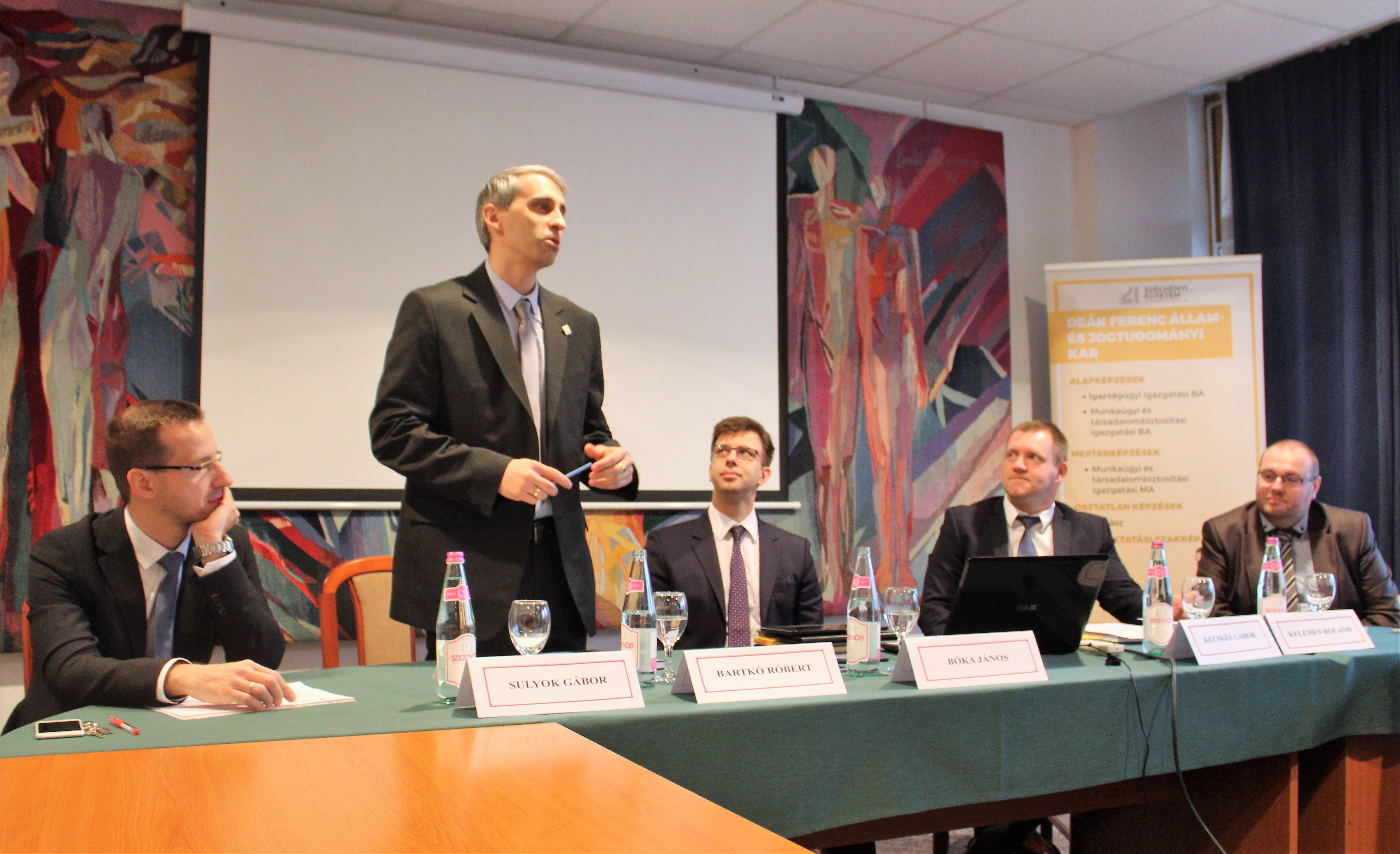 Kecskés Gábor, a jogi kar tudományos és nemzetközi dékánhelyettese nyitotta meg a projektzáró rendezvényt. Kiért arra, hogy az Igazságügyi Minisztérium és a kar több évre visszatekintő együttműködése kutatás-, oktatásfejlesztési programok, perbeszéd versenyek támogatásában is megnyilvánul. Ennek egyik eredménye „A terrorizmus elleni küzdelem aktuális kérdései a XXI. században” című projekt, amelynek vezetését Bartkó Róbert egyetemi docens vállalta és vitte sikerre. A témát átfogó, a kar számos tanszékének együttműködésével elkészült tanulmánykötetet már be is mutatták a rendezvényen.