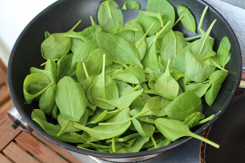 2- A spenótot szintén kevés olíva olajon, pici vajon megpirítjuk, zúzott fokhagymát keverünk hozzá a végén, friss borsot és sózzuk.