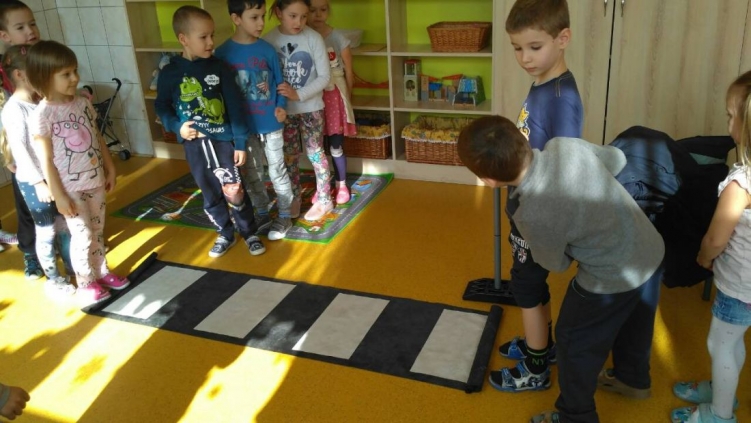 Az elméleti előadások során a gyerekek egy felállított pályán gyakorolhatták a szabályos közlekedést, megfigyelhették a közlekedési táblákat és elsajátíthatták az úttesten való áthaladás ismérveit.