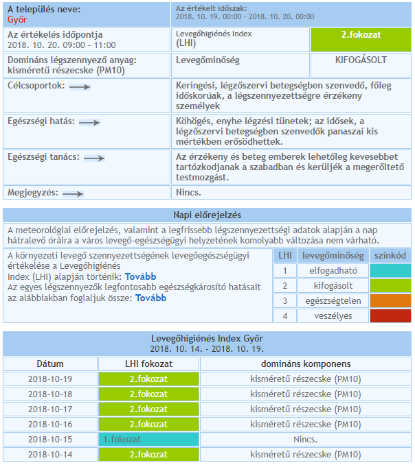 Emellett számos település van – Budapest, Debrecen, Dorog, Eger, Esztergom, Győr, Miskolc, Nyíregyháza, Oszlár, Pécs, Putnok, Sopron, Székesfehérvár, Szolnok, Szombathely, Tököl, Vác, Várpalota és Veszprém -, ahol továbbra is kifogásolt a levegőminőség – írta az OKI.