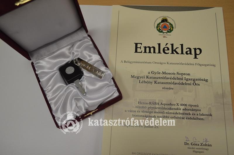 A vers elhangzása után Sallai Péter tűzoltó dandártábornok, a Győr-Moson-Sopron Megyei Katasztrófavédelmi Igazgatóság igazgatója, ünnepélyesen átadta a jármű kulcsát Szabó András tűzoltó őrnagynak, a Mosonmagyaróvári Hivatásos Tűzoltó-parancsnokság parancsnokának. A tábornok elmondta, hogy a fejlesztésnek köszönhetően Győrben kettő, Csornán pedig egy új Rába R16-os szolgálja a megye tűzvédelmét, mostantól pedig már a mosonmagyaróvári hivatásos tűzoltó-parancsnoksághoz tartozó, öt éve hasznosan működő lébényi katasztrófavédelmi őrs tűzoltóinak beavatkozását is egy új, modern technika segíti, amely hozzájárul a környéken élők még nagyobb biztonságához