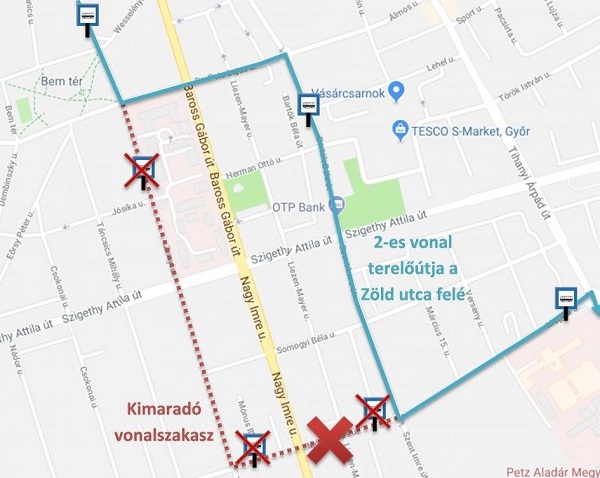Ezért a 2-es jelzésű autóbuszjáratok a Zöld utca felé is terelőúton, a Zrínyi utca (Bem tér) – Dr. Petz Lajos utca – Bartók Béla út – Szent Imre út – Magyar utca útvonalon közlekednek, és ideiglenesen nem érintik a „Zrínyi utca, kórház” – „Mónus Illés utca, virágbolt” – „Mónus Illés utca, Szent Imre út” megállóhelyeket, helyettük a „Bartók Béla út, vásárcsarnok” megállóhelyen állnak meg.